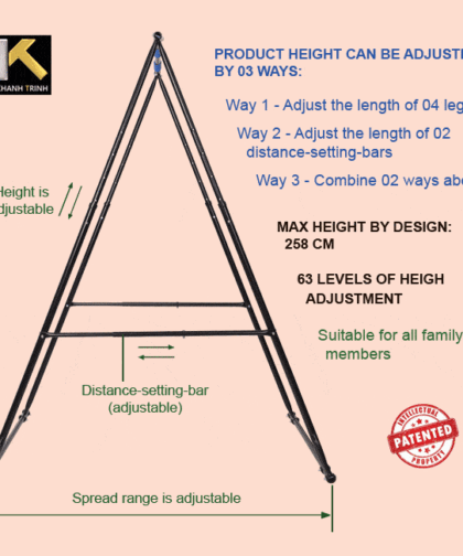The KT folding pull up bar model KT1.1520 has the max height by design of 258cm. This is currently our biggest and heaviest model, made from thick tubes. Its height can be adjusted easily in many levels without spanner or wrench, suitable for all users less than 200cm and weighing less than 200kgs. That means this model is designed so that the toes of users under 200cm tall will not touch the ground when they cling and hang on the horizontal handle-bar with their arms.